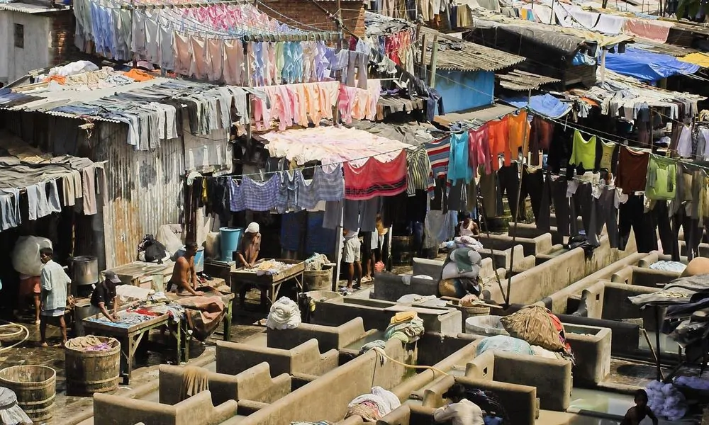 Mumbai központjában, a Mahalaxmi vasútállomás mellett, egy különleges negyed rejtőzik: a Dhobi Ghat, amely a világ legnagyobb szabadtéri mosodájaként ismert. Itt naponta több ezer ember – férfiak és nők, akik generációk óta ezzel foglalkoznak – mos, szárít és vasal több tonnányi ruhát, lepedőt, egyenruhát és szállodai textíliát. A látvány lenyűgöző: a betonmedencék százai között dolgozók kézzel súrolják a ruhákat, a kifeszített szárítóköteleken színek tucatjai lengenek a szélben, a háttérben pedig a modern Mumbai felhőkarcolói emelkednek.
