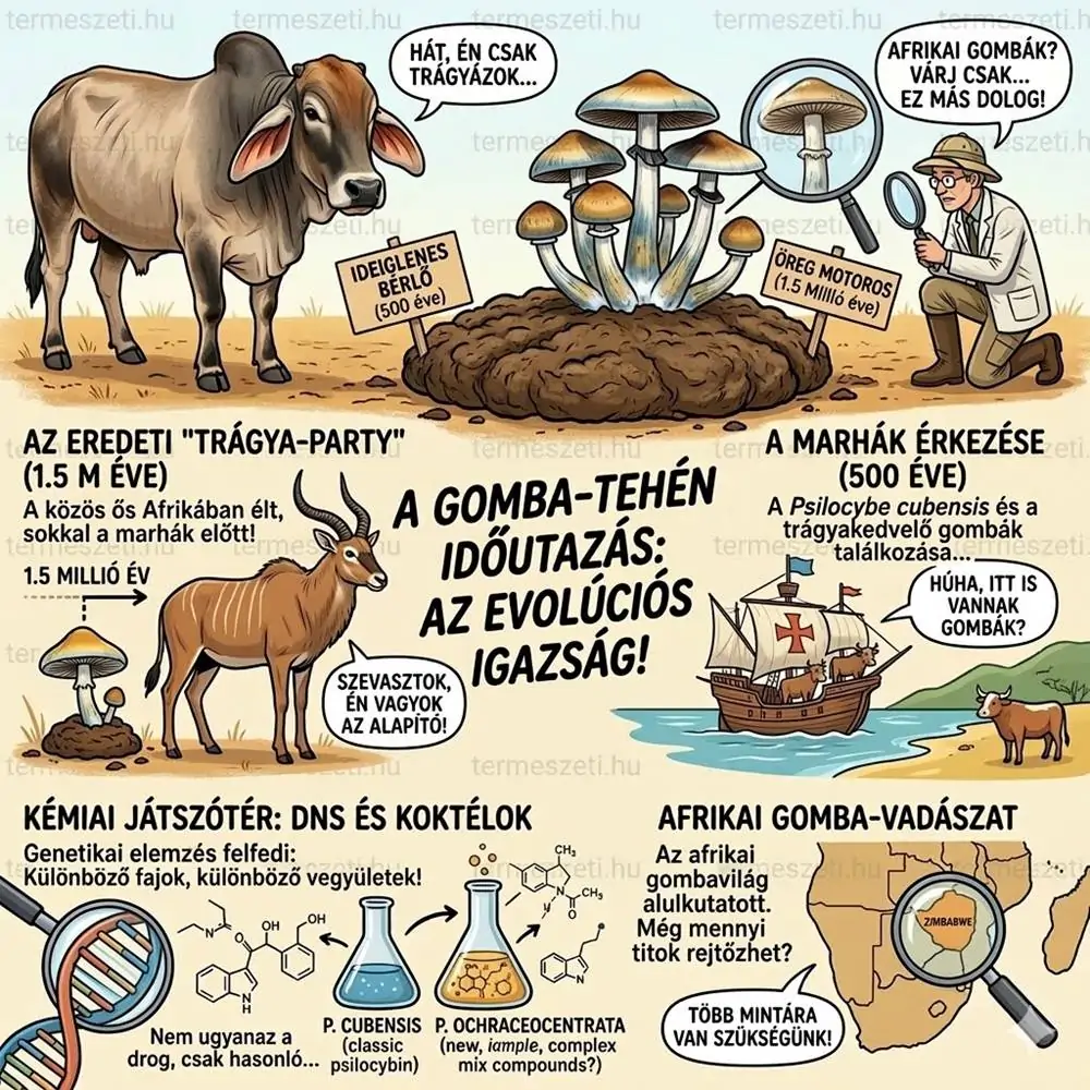 A mostani kutatás azonban azt sugallja, hogy a kép ennél jóval régebbi és jóval bonyolultabb. A frissen leírt afrikai faj és a Psilocybe cubensis egy közös ősre vezethető vissza, amely a becslések szerint nagyjából 1,5 millió évvel ezelőtt élt. Ez pedig bőven megelőzi mind a szarvasmarha-domesztikációt, mind az atlanti hajózást, mind azt a korszakot, amikor az ember elkezdett nagy léptékben kontinenseket összekötni. Magyarán: lehet, hogy nem a tehén vitte a gombát a világba, hanem a gomba már jóval korábban ott volt a történetben, csak más szereplőkkel.