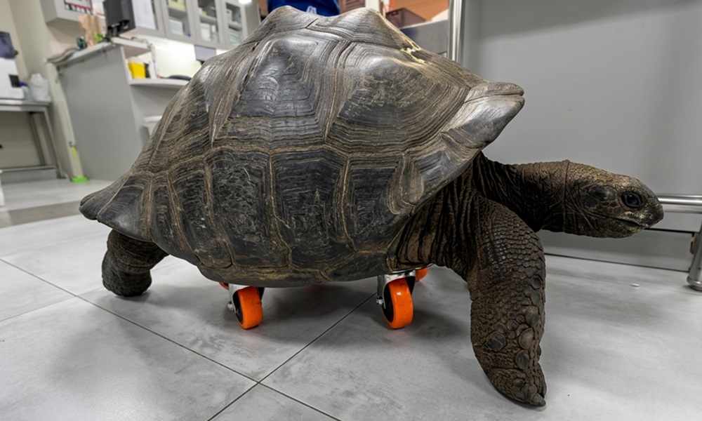 A szakemberek négy kereket erősítettek az állat haspáncéljához, vagyis a plasztronhoz – ez a teknősök és teknősfélék páncéljának alsó része. A cél nem az volt, hogy látványos guruló szerkezetet készítsenek belőle, hanem az, hogy csökkentsék a hátsó lábakra nehezedő terhelést, miközben mozgásra ösztönzik az állatot.